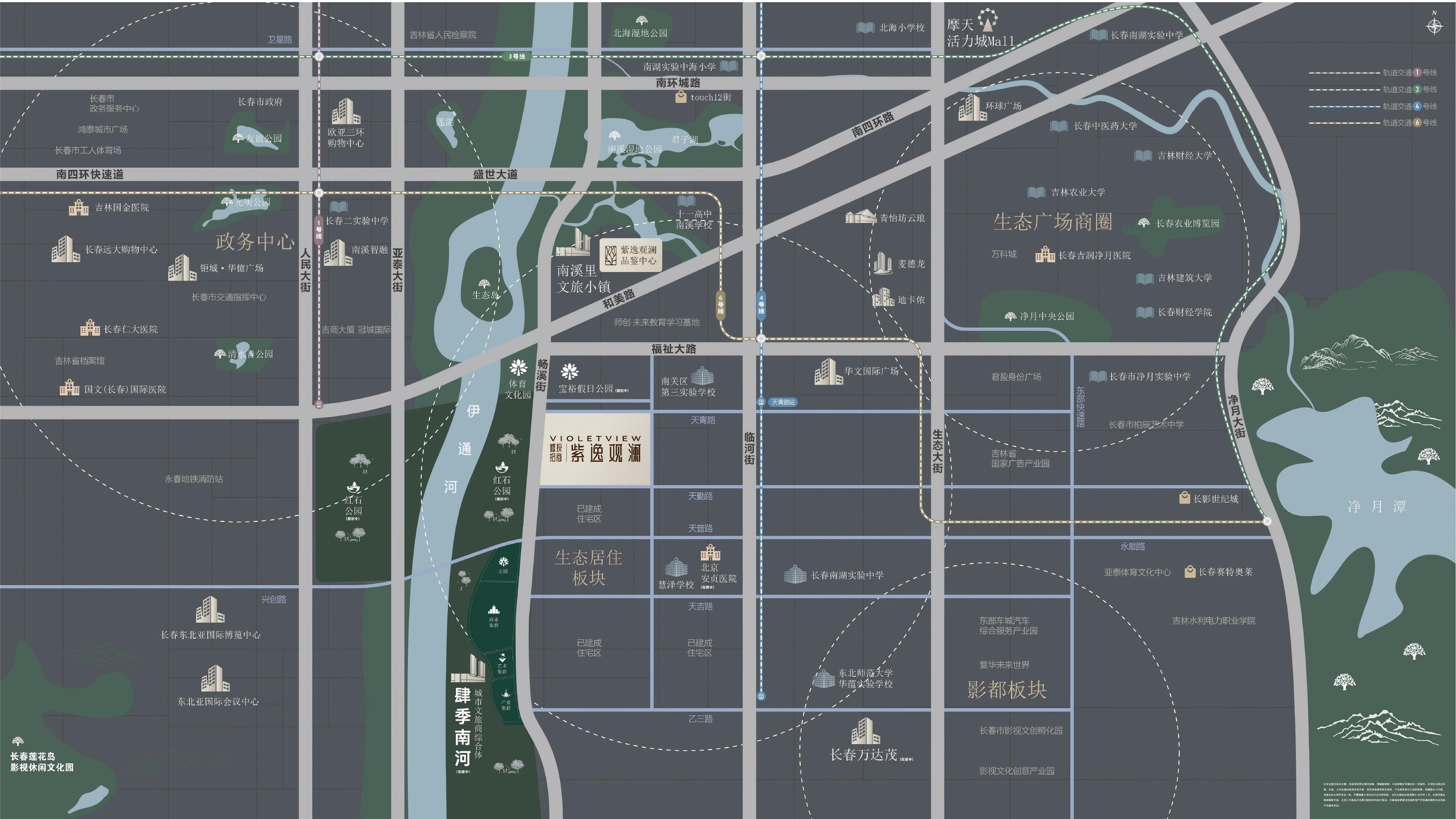 城投招商紫逸观澜项目地处南城核心,约6公里直达位于南关区的市政府大楼,同半径覆盖净月中央公园和高新区八一湖公园,约7公里直抵经开区摩天活力城!是南关主城、净月、高新、经开四大价值板块的几何中心,长春城市南拓的黄金交叉点!