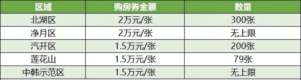展会期间,在“长11条”政策基础上,部分区域拿出万元购房券进行补贴!其中北湖区、净月区给予购房者2万元一张的购房券,汽开区、莲花山、中韩示范区则给予1.5万元一张的购房券!可与“长11条”政策同时申领并叠加使用,若满足多个条件,光是政府给的补贴最高就可达到14万元!其他城区虽无购房券发放,但有“长11条”兜底,如若满足多个条件,最高也可补贴到12万元!