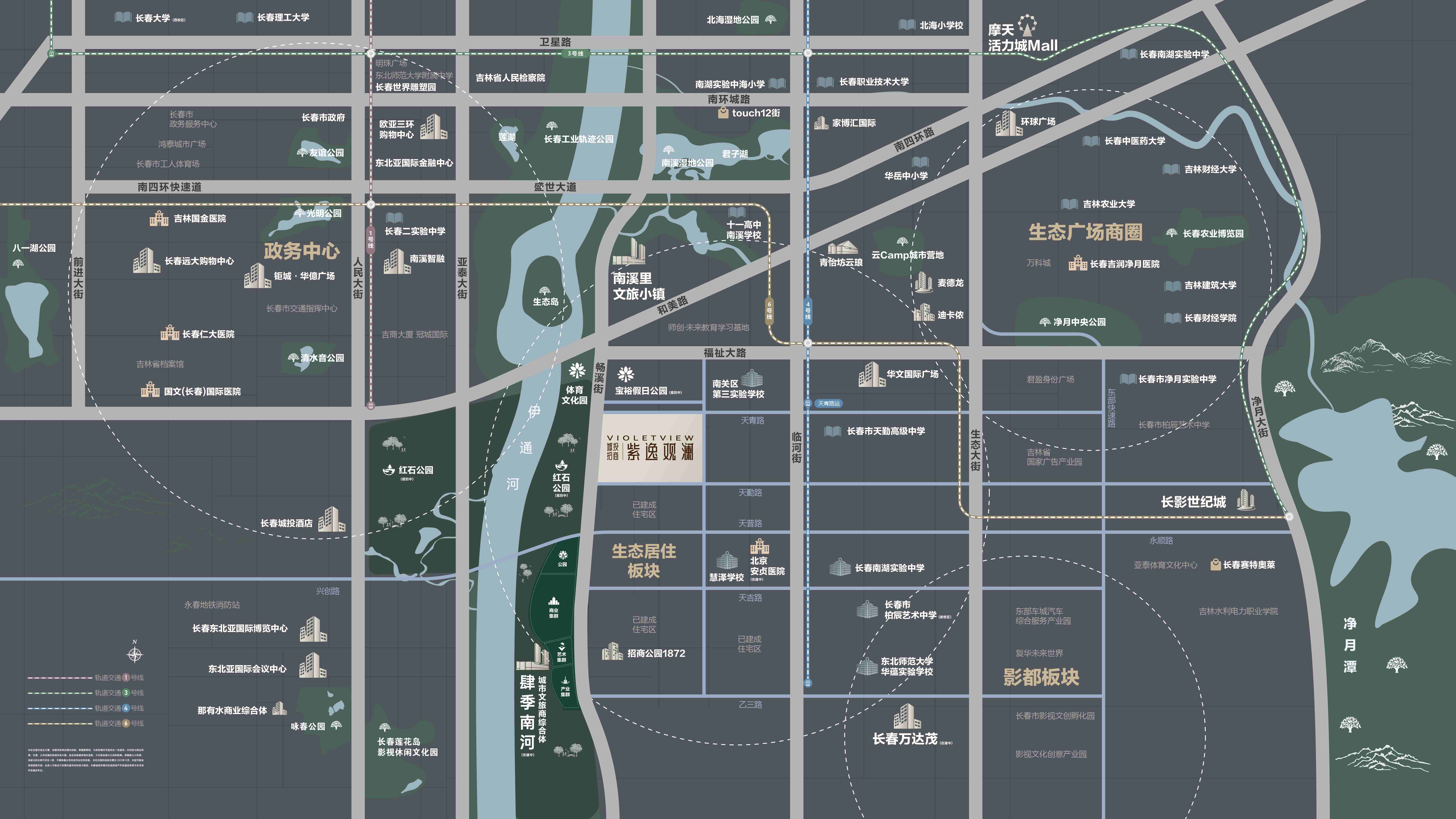 城投招商紫逸观澜项目地处南城核心,约6公里直达位于南关区的市政府大楼,同半径覆盖净月中央公园和高新区八一湖公园,约7公里直抵经开区摩天活力城!是南关主城、净月、高新、经开四大价值板块的几何中心,长春城市南拓的黄金交叉点!