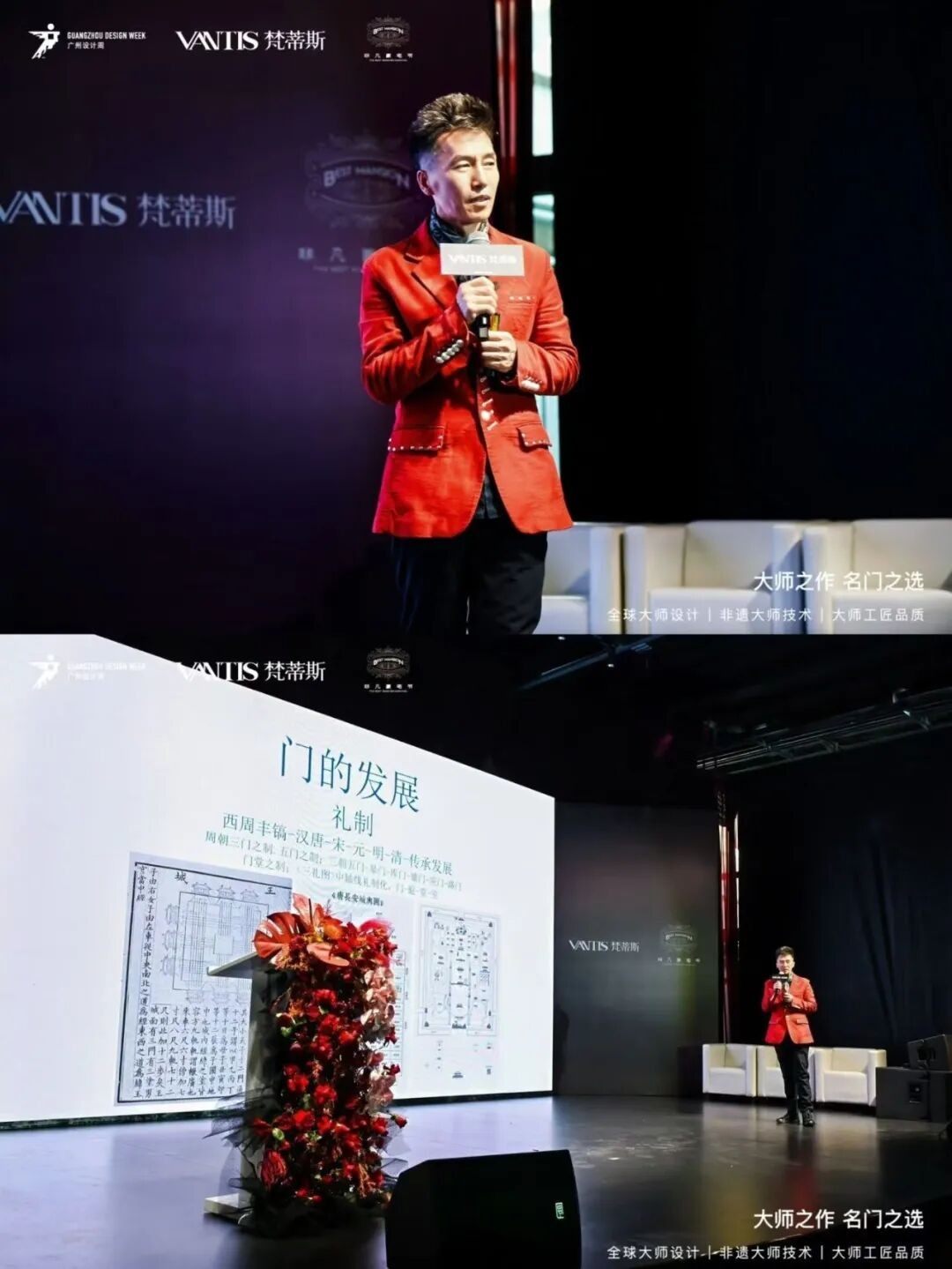 黎水仁佳设计创始人叶永志则以“全宅统管:定义设计新边界”为主题展开深度分享。作为名门望族御用设计师,叶永志结合其海内外高端私宅项目经验,提出"门是内部情绪的开端"的独特见解,阐述了如何在私宅设计中融合传统门文化与当代艺术,并高度赞赏了梵蒂斯作为“中国高端入户门第一品牌”的专业落地支撑。分享了“2025梵蒂斯广州设计周大师之作设计展”合作项目,推动当代门艺术进入更广泛公众视野,也为“全宅统管”理念提供了全新注解。