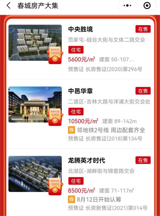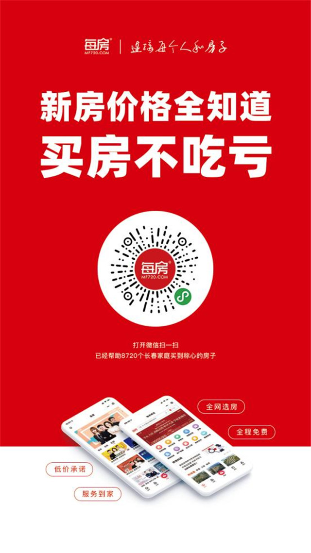 每房讯 一大波优质特价房源,购房红包……超多福利全部给你!每房三周年庆,“每”好期待,他来了!7月20日是每房成立三周年的日子,为感谢春城百姓一直以来的支持与陪伴,每房特此举办春城房产大集活动。此次活动我们还精心为大家准了超多精美礼品,720每房节,在这个夏日一定会为春城增添一道靓丽的风景线。  优质房源 等您来选 在这次春城房产大集中,每房专业咨询师将竭诚为每一位购房者服务,活动期间会现场为您匹配优质房源,同时配有专车接送,专人陪看;并承诺全网最低,买贵就陪;不收佣金,全程免费。相信定会给您带来轻松、舒适、专业、实惠的购房体验。 特价房源 等您秒杀 春城房产大集活动期间更有海量特价房源等您秒杀。每房人将走进长春多个社区,来到您的身边。为购房者提供最划算的特价房源,帮助购房者买到称心的超低价好房。同时还可以为业主登记二手房源,房源买卖,都能来转转!参与活动还可以领取每房为您准备的精美礼品!  万元红包 等您来拿 本次活动,每房将联手全城诸多品牌开发商提供在线购房红包,每房精选小程序涵盖了几乎长春所有楼盘,随时随地动动手指,即可掌握楼盘信息,在小程序房产大集活动页面中即可领取购房红包,最高金额10000元,只要您买房,便能直接领取。超值购房钜惠,不要错过哦。买新房,找每房!“每”好期待,真的给力!  720每房节,属于买房人的节日,春城房产大集,超多大礼、超大红包等您来拿,识别下方二维码,就能参与哦!(悦)